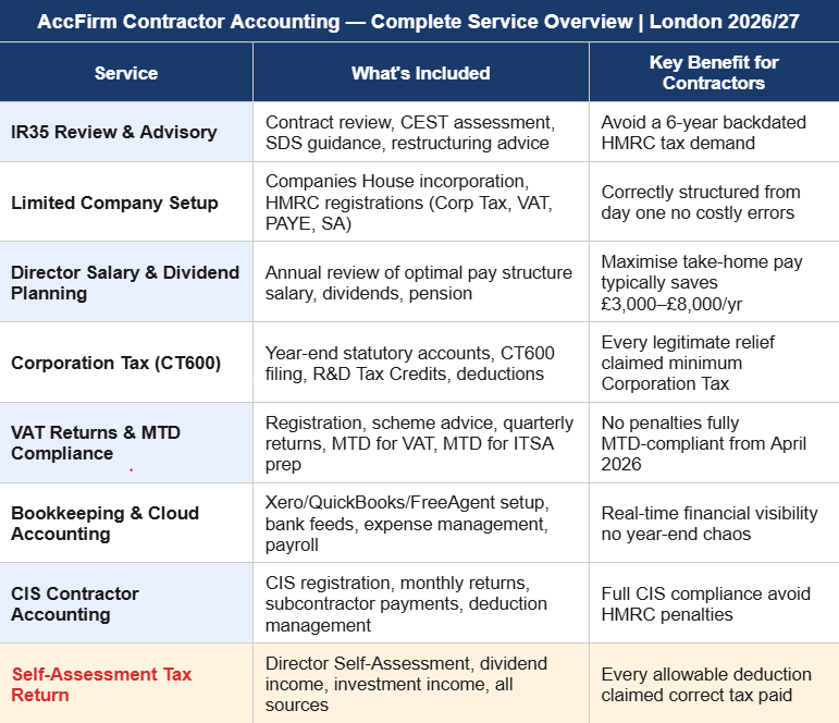 AccFirm London contractor clients benefit from a dedicated accountant with deep expertise in all aspects of contractor taxation IR35 reviews, limited company management, salary and dividend optimisation, VAT, and Making Tax Digital compliance. We are not a generalist accounting firm that happens to serve a few contractors. Contractor accounting is a core specialisation, and every client receives advice that reflects that depth of expertise.