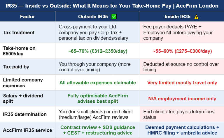 IR35 (the off-payroll working rules) is tax legislation designed to identify contractors who are working in a way that is effectively equivalent to employment using a limited company as a vehicle to reduce tax. If HMRC determines that a contractor’s engagement falls inside IR35, the contractor is taxed similarly to an employee meaning Income Tax and National Insurance are deducted at source, and most limited company expenses cannot be claimed. The financial impact is significant: a typical London IT contractor earning £500 per day pays around £20,000–£30,000 more tax inside IR35 than outside. AccFirm provides professional IR35 contract reviews to protect your outside-IR35 status and manage your position correctly if you do work inside IR35.