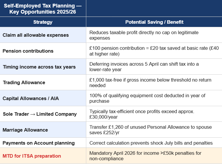 For a typical self-employed professional in London, key tax planning areas include the eight strategies shown in the table above each of which AccFirm reviews as part of every client relationship. From pension contributions and capital allowances to payments on account planning and MTD for ITSA preparation, we ensure you are always financially optimised and fully compliant.