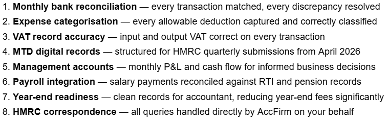 Bank reconciliation should be completed at minimum monthly and ideally more frequently for businesses with high transaction volumes. Reconciling your accounts monthly ensures any discrepancies are identified and resolved promptly, your VAT figures are accurate for each return period, and your financial position is always current. AccFirm reconciles every client’s accounts monthly as a standard part of every bookkeeping package this is not an optional add-on.
