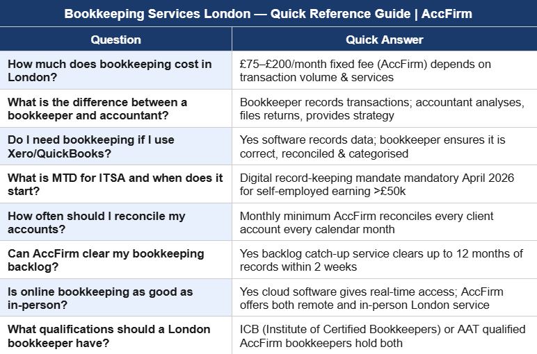 Bookkeeping costs in London vary depending on your transaction volume, industry, and the services included. As a general guide: sole traders and freelancers with a low transaction volume typically pay between £75 and £150 per month for a full monthly bookkeeping service. Small limited companies and SMEs with higher transaction volumes typically pay between £150 and £350 per month, including bank reconciliation, VAT record-keeping, and management accounts. AccFirm charges fixed monthly fees based on your specific needs no hourly rates, no surprise invoices. Contact us for a free, transparent quote.